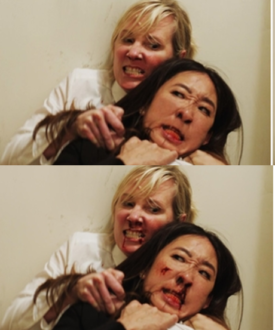 – O cartaz é um screenshot do filme onde parte do sangue do rosto das atrizes foi removido digitalmente. Veja como fica a comparação do cartaz para a cena real: